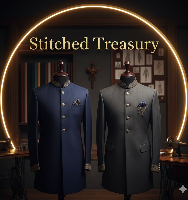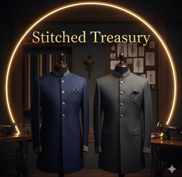 Our Stitched Treasury showcases expertly crafted Sherwanis, Suits, and Indo-Western apparel, tailored for the discerning gentleman who appreciates precision, tradition, and an impeccable fit.
